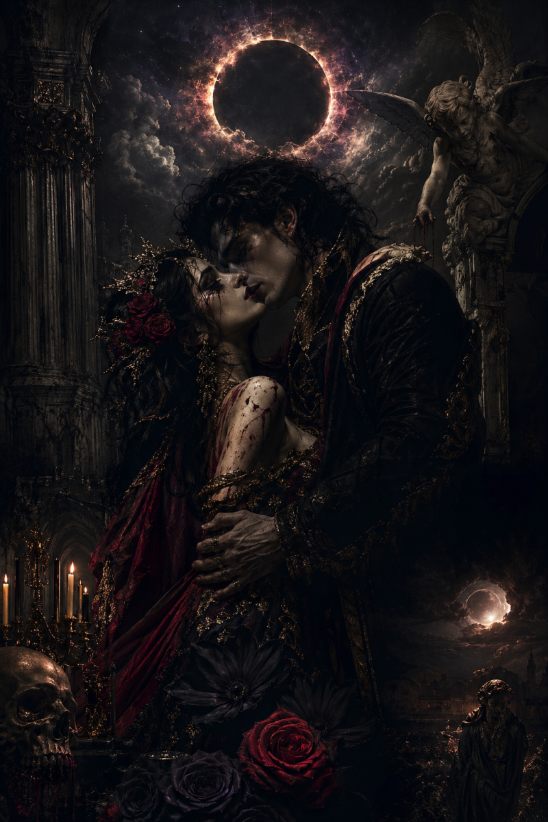“Embrace Under a Dark Eclipse” is a digital painting by Osiris Valdés inspired by the poem Symphony in D Minor for an Apocryphal Love. The work translates the lyrical intensity of the text into a visually symbolic scene with deep emotional resonance, where love manifests as a cosmic and transcendent event. Under a dark eclipse, the piece evokes an atmosphere of mysticism and poetic tension, where desire, shadow, and the sacred converge in a single eternal moment